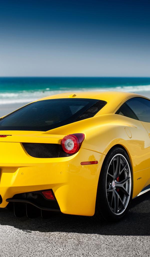 Обои Желтый Феррари 458 припаркован у моря