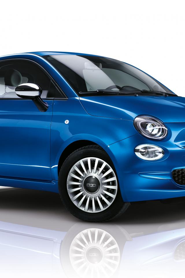 Обои Синий автомобиль Fiat 500 Mirror, 2018 на белом фоне