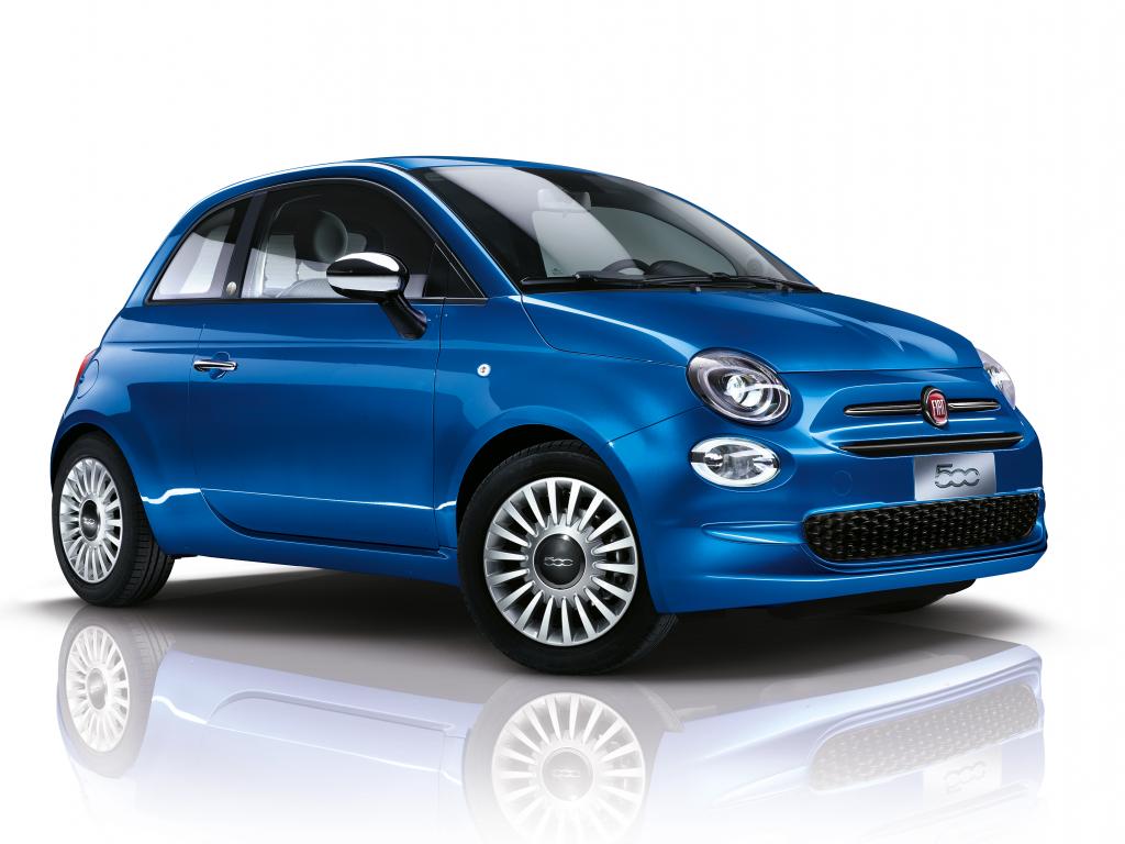 Обои Синий автомобиль Fiat 500 Mirror, 2018 на белом фоне