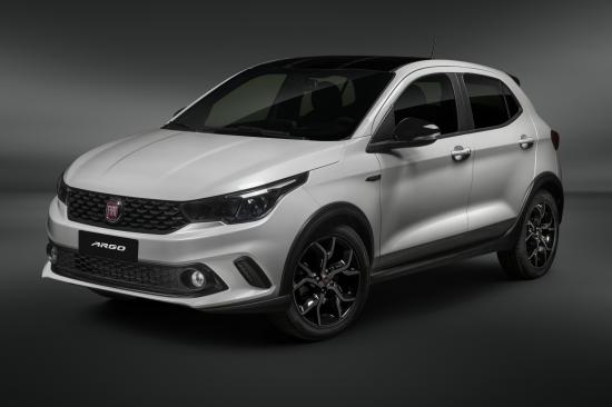 Обои Белый автомобиль Fiat Argo HGT, 2019 года на сером фоне