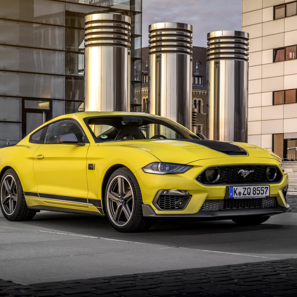 Обои Быстрый желтый автомобиль Ford Mustang Mach 1 2021 года у здания
