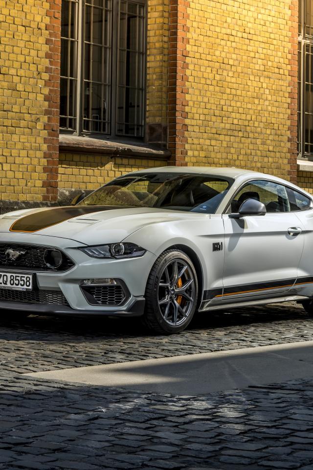 Обои Белый автомобиль Ford Mustang Mach 1 2021 года на улице