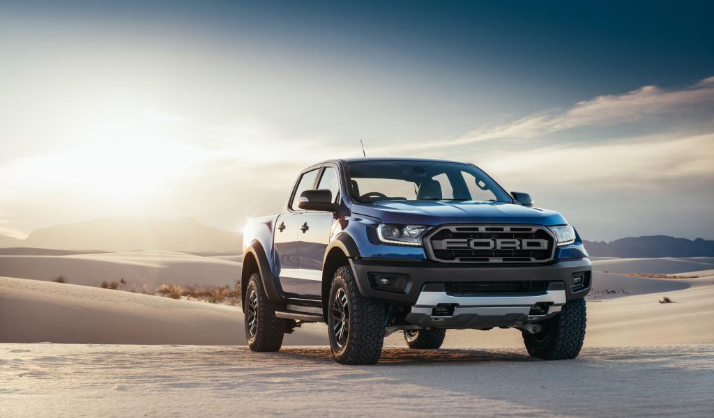 Обои Синий пикап Ford Raptor, 2019 года на песке