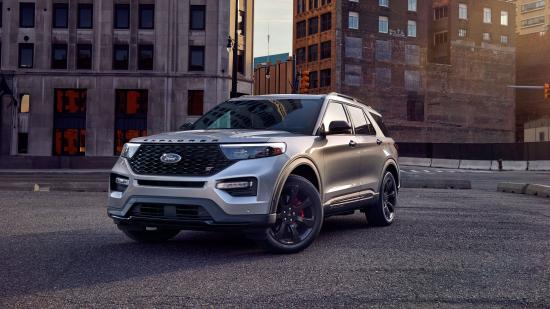 Обои Большой внедорожник Ford Explorer ST 2020 года на фоне зданий