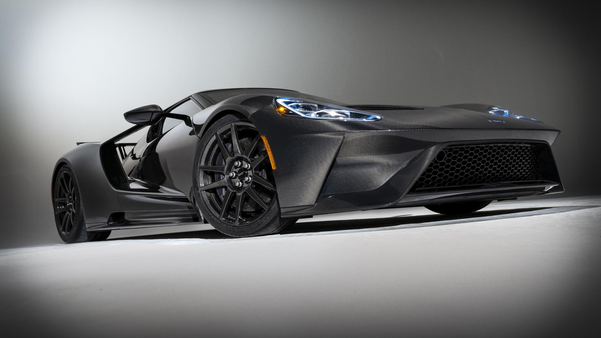 Обои Автомобиль Ford GT Liquid Carbon, 2020 года на сером фоне