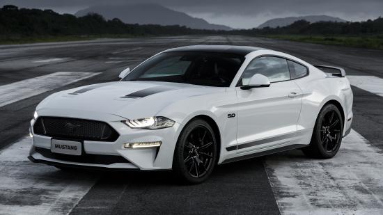 Обои Белый автомобиль Ford Mustang GT Black Shadow 2019 года на дороге