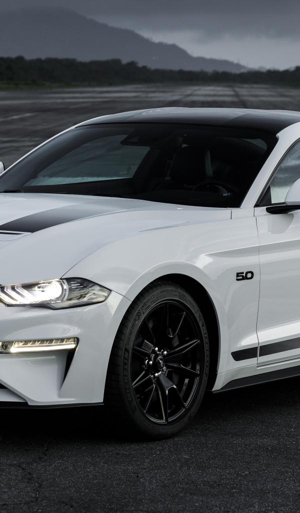 Обои Белый автомобиль Ford Mustang GT Black Shadow 2019 года на дороге