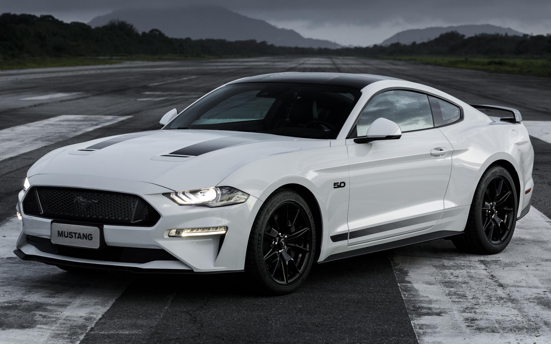 Обои Белый автомобиль Ford Mustang GT Black Shadow 2019 года на дороге