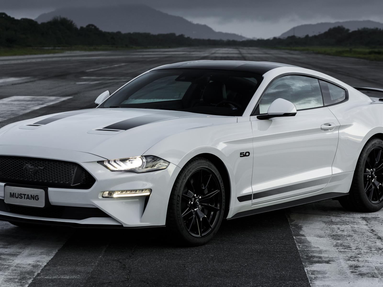 Обои Белый автомобиль Ford Mustang GT Black Shadow 2019 года на дороге