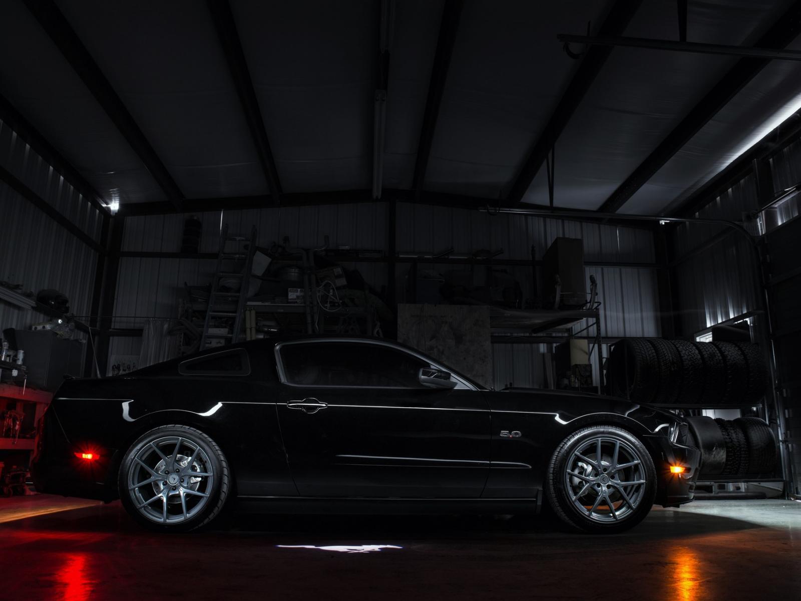 Обои Черный спортивный Ford Mustang в гараже