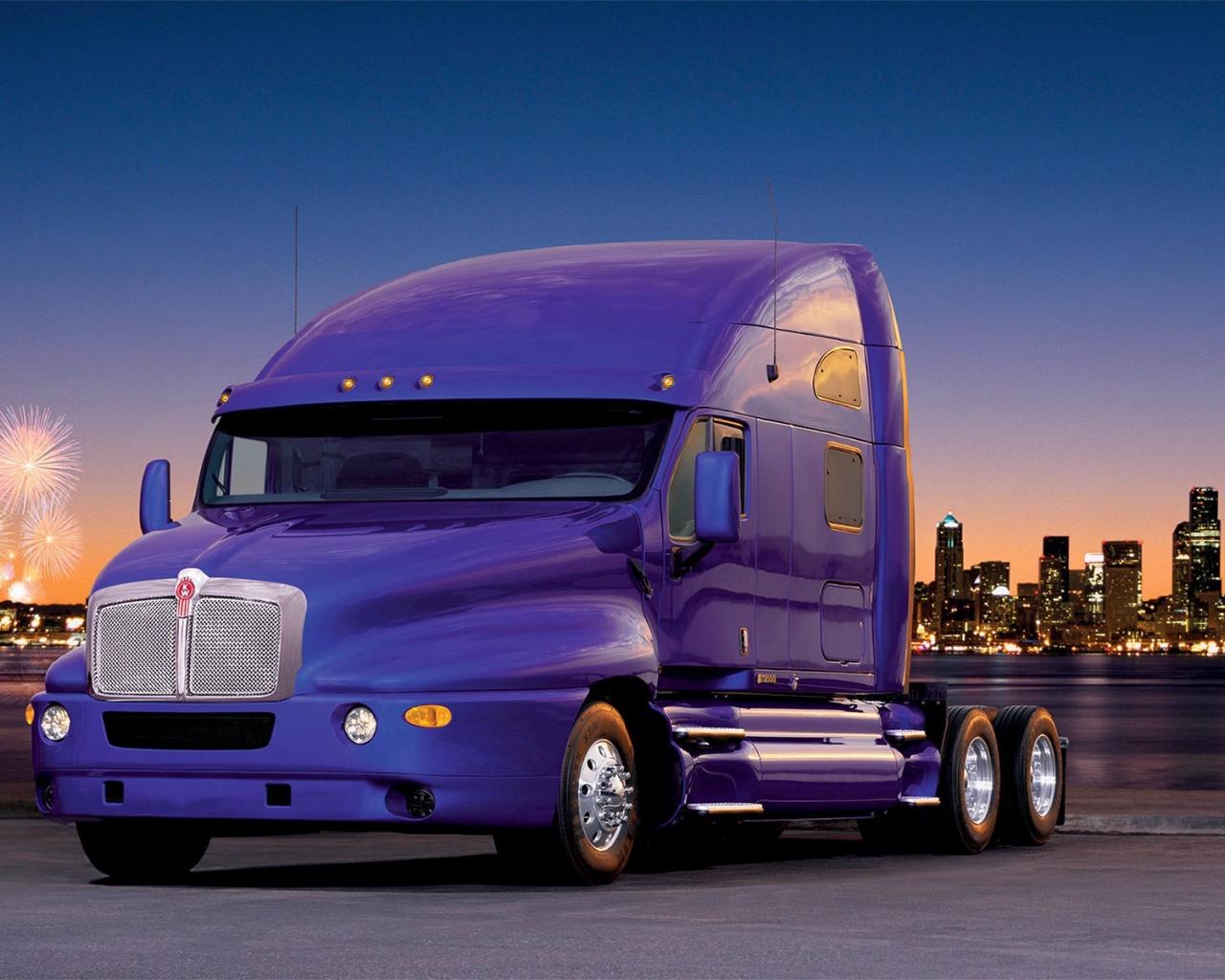 Обои Мощный сиреневый тягач на фоне города
