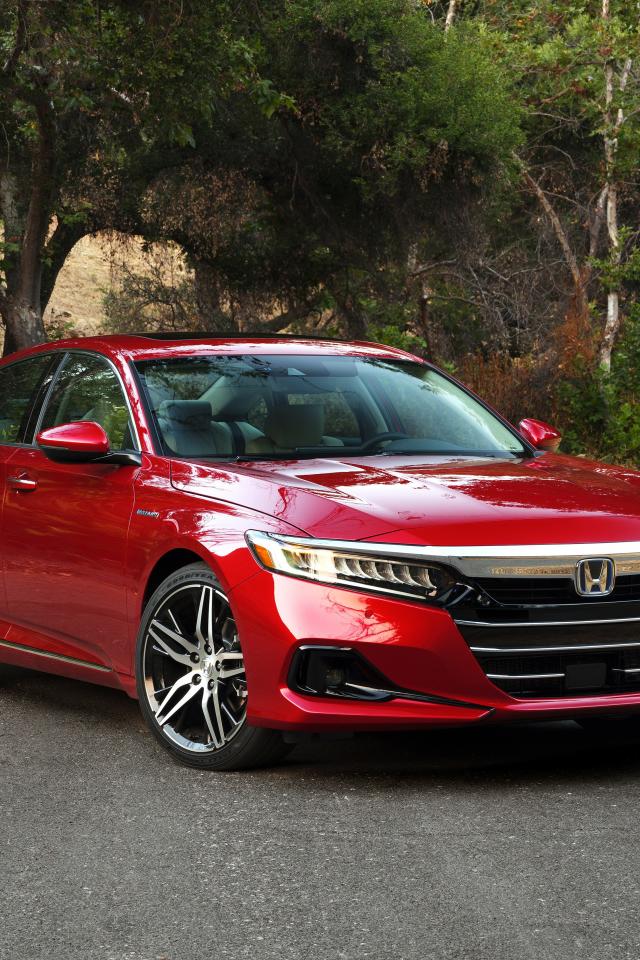 Обои Красный автомобиль Honda Accord Touring Hybrid, 2021 года на дороге в парке