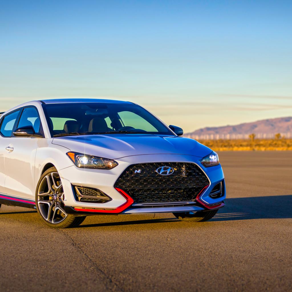 Обои Белый автомобиль Hyundai Veloster N, 2018 на асфальте в лучах солнца