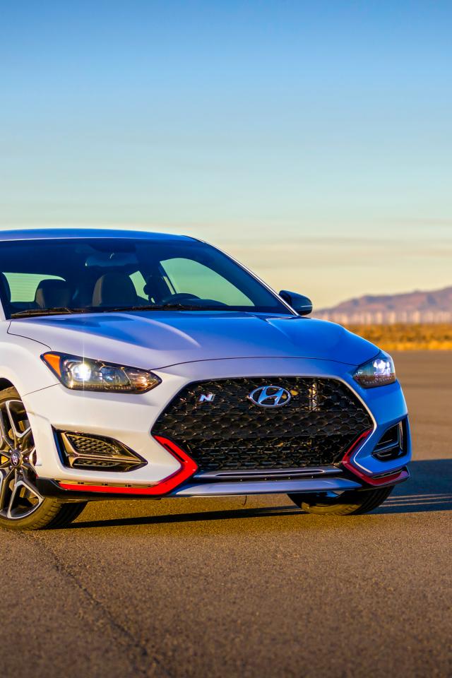 Обои Белый автомобиль Hyundai Veloster N, 2018 на асфальте в лучах солнца
