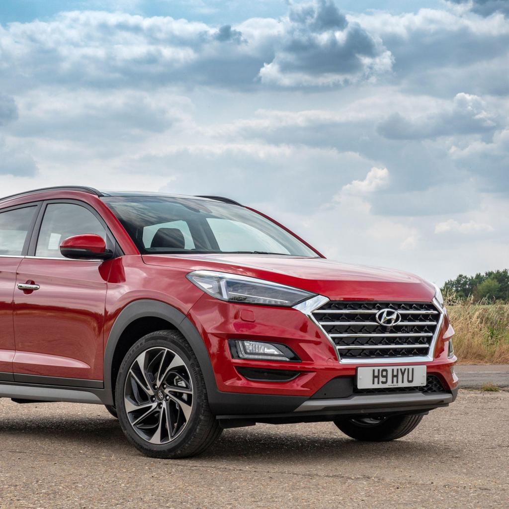 Обои Красный автомобиль Hyundai Tucson, 2019 года под пасмурным небом