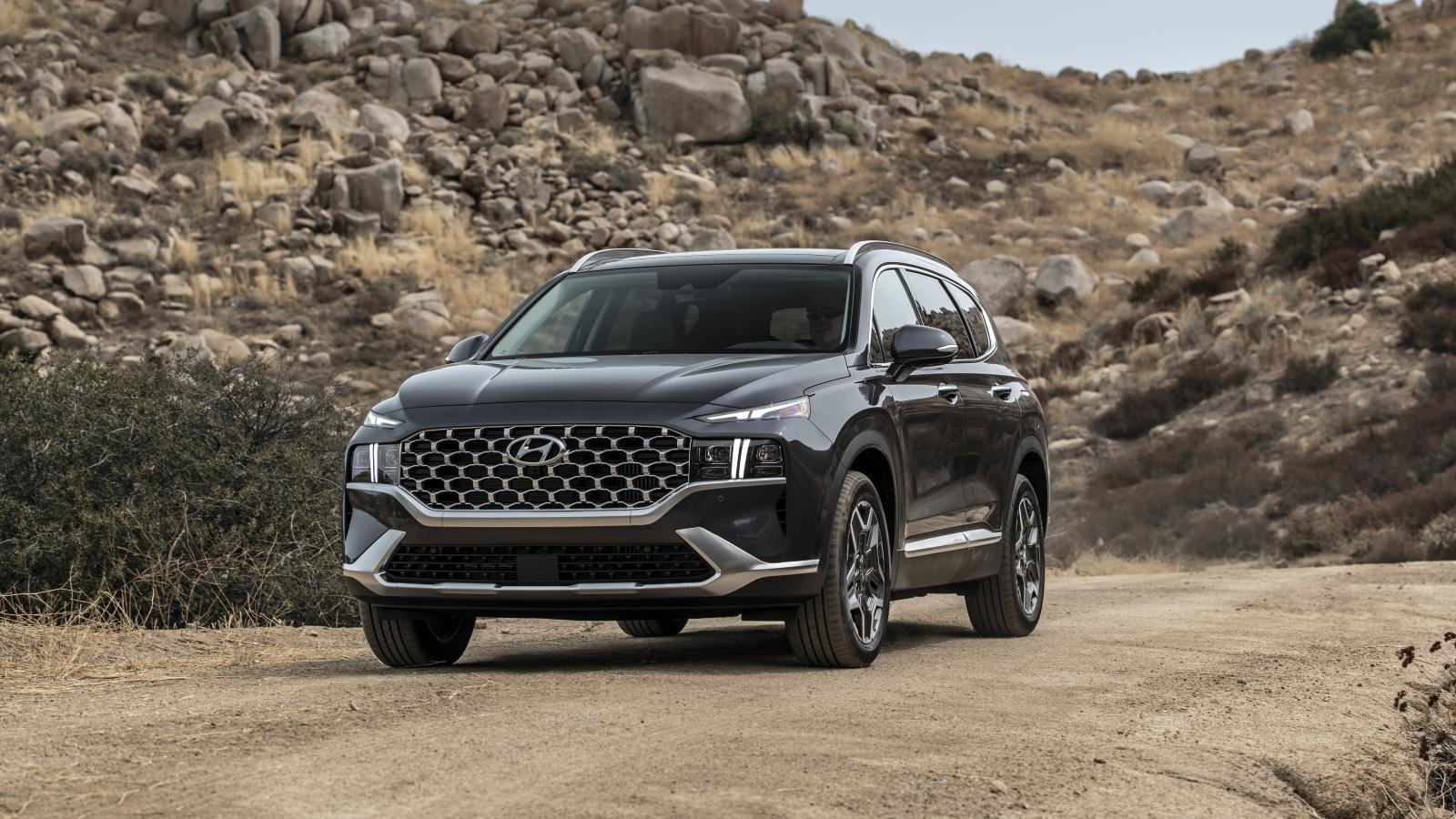 Обои Черный автомобиль Hyundai Santa Fe Hybrid, 2021 года у камней