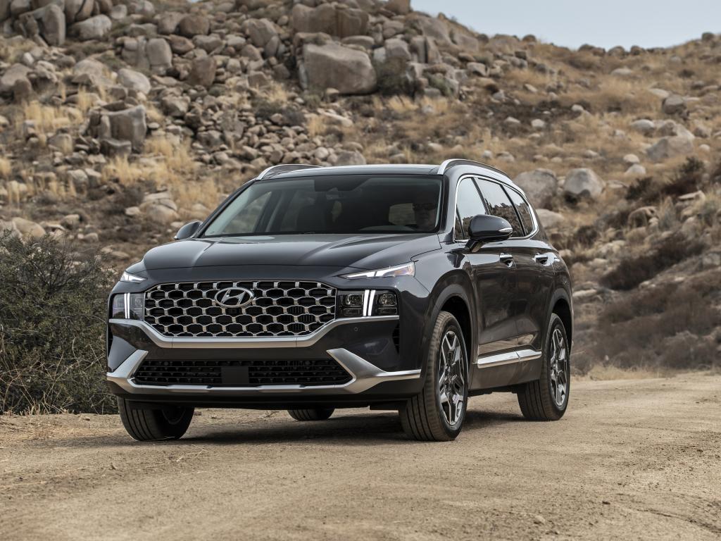 Обои Черный автомобиль Hyundai Santa Fe Hybrid, 2021 года у камней