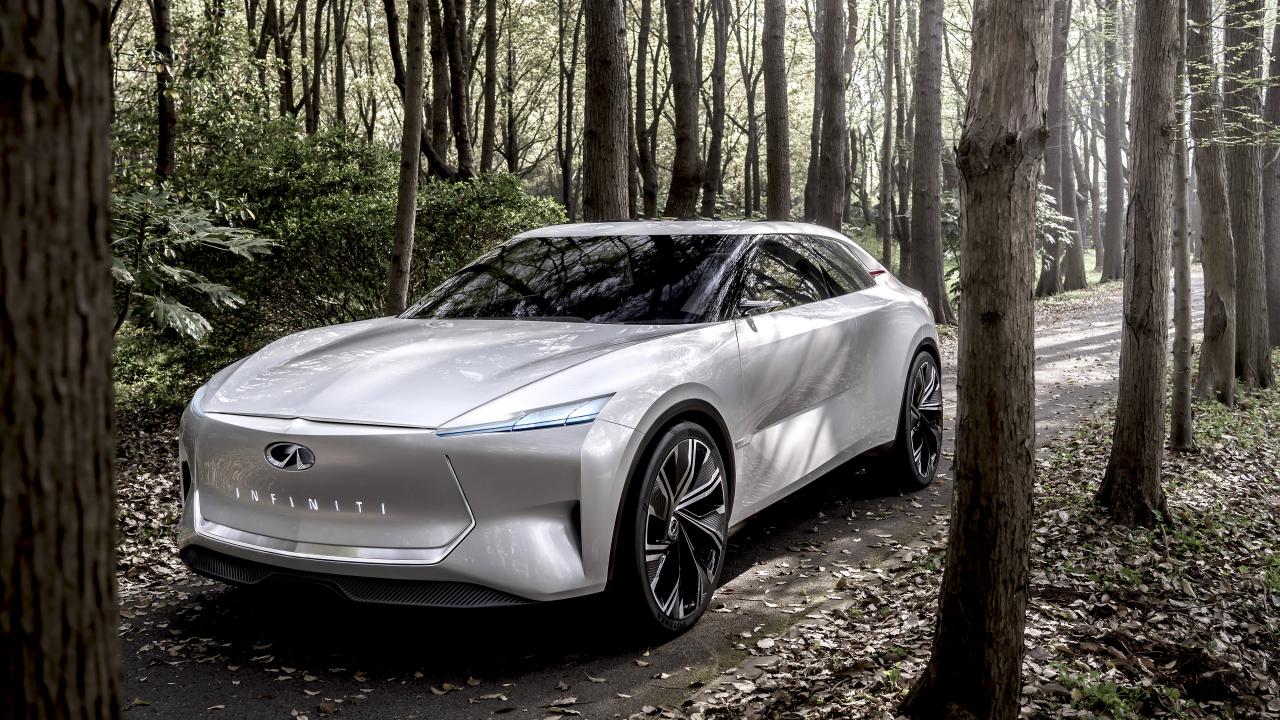 Обои Серебристый автомобиль Infiniti Qs Inspiration 2019 года в лесу