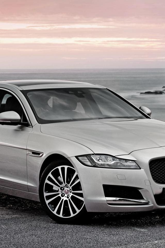 Обои Серебристый автомобиль Jaguar XF на фоне океана
