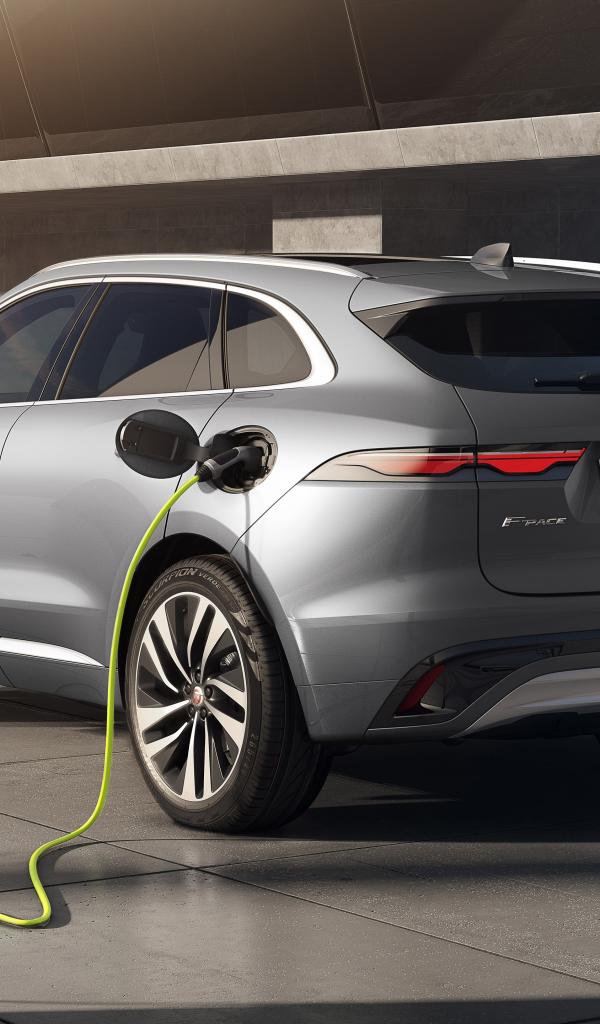 Обои Серебристый автомобиль Jaguar F-Pace P400e AWD 2020 года на заправке
