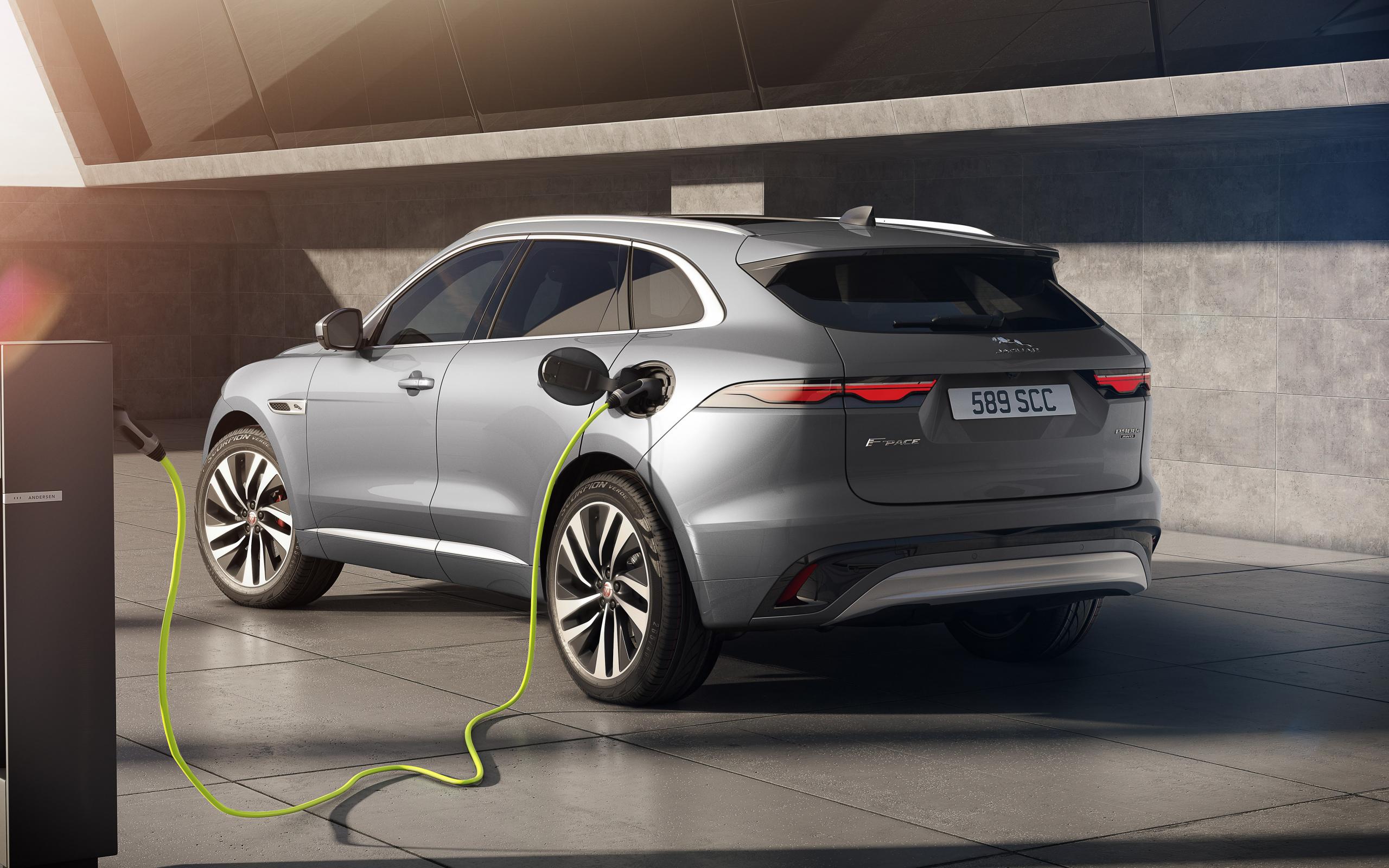 Обои Серебристый автомобиль Jaguar F-Pace P400e AWD 2020 года на заправке