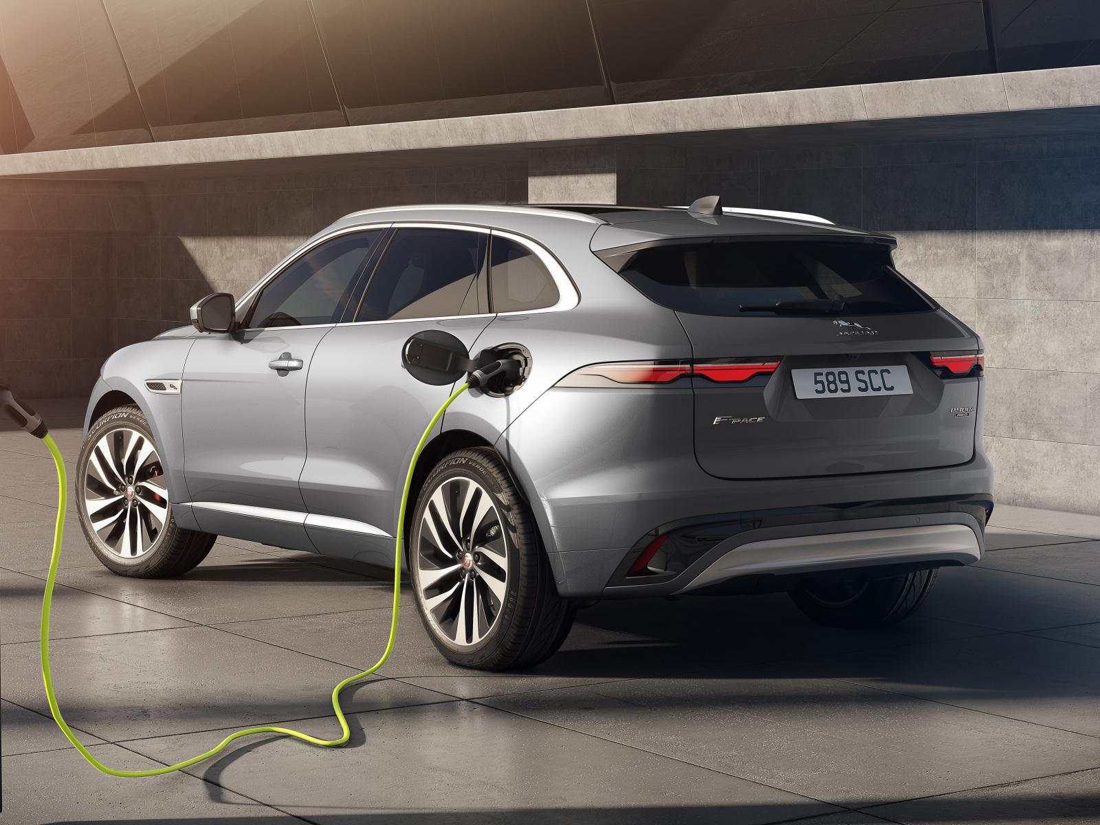 Обои Серебристый автомобиль Jaguar F-Pace P400e AWD 2020 года на заправке