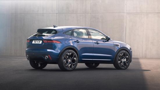 Обои Синий кроссовер Jaguar E-Pace R-Dynamic Black Pack 2021 года вид сзади