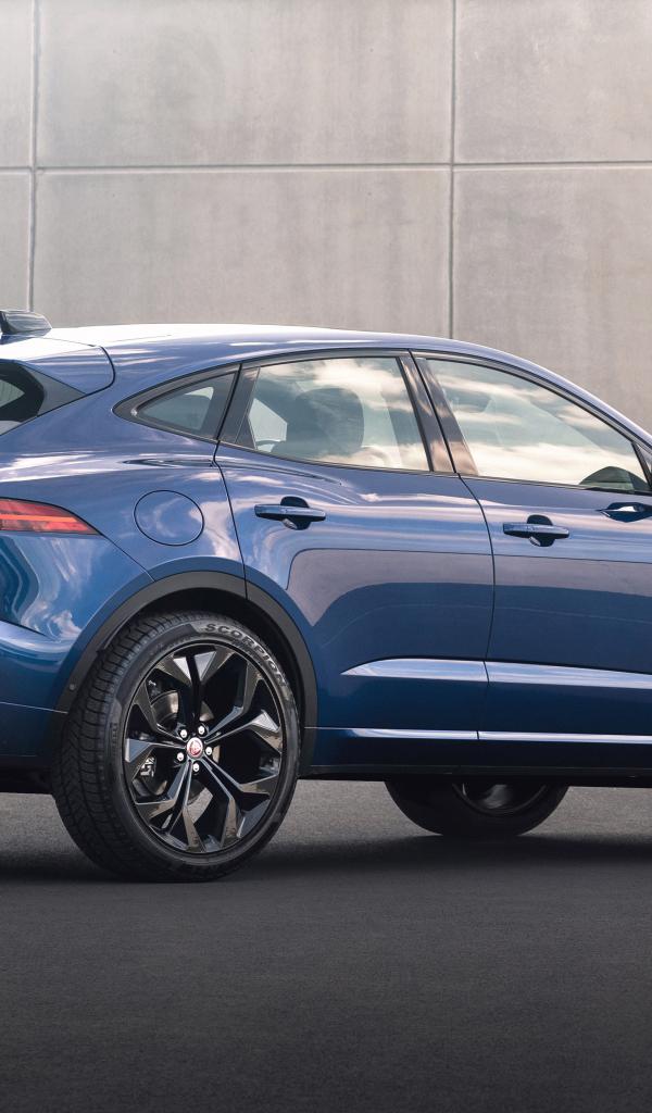 Обои Синий кроссовер Jaguar E-Pace R-Dynamic Black Pack 2021 года вид сзади