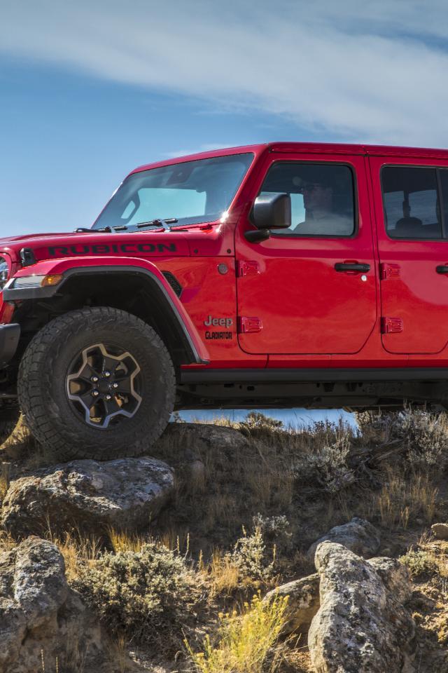 640x480600x1024Обои Красный пикап Jeep Gladiator Rubicon на холме с камнями