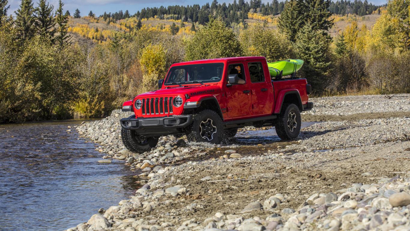 640x480600x1024Обои Красный пикап Jeep Gladiator Rubicon, 2020 года у реки