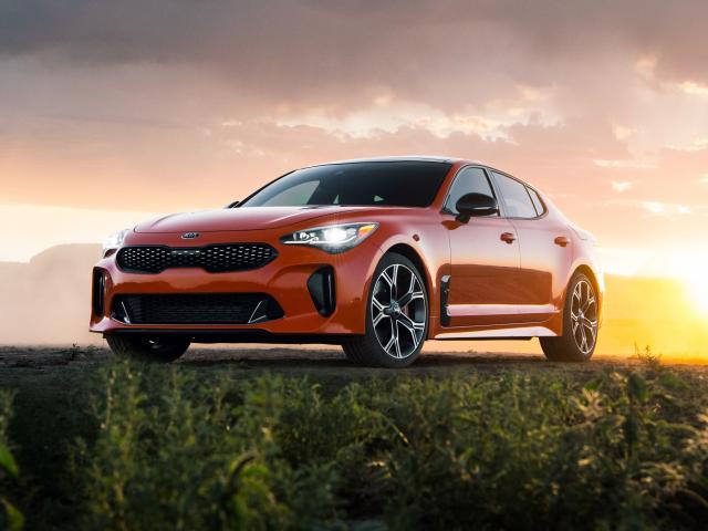 Обои Оранжевый автомобиль Kia Stinger GTS, 2020 года на закате