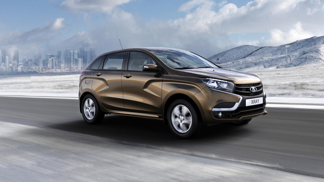 Обои Автомобиль Лада XRAY на трассе на фоне красивого неба