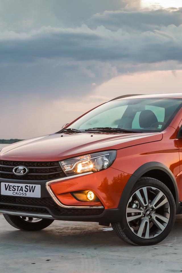 Обои Оранжевый внедорожник Лада Vesta Cross у воды