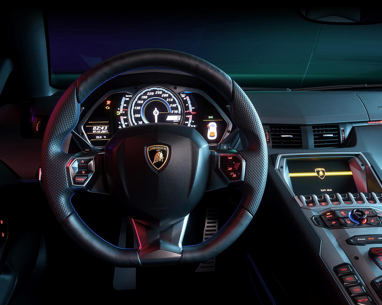 Обои Черный кожаный руль автомобиля Lamborghini Aventador CGI