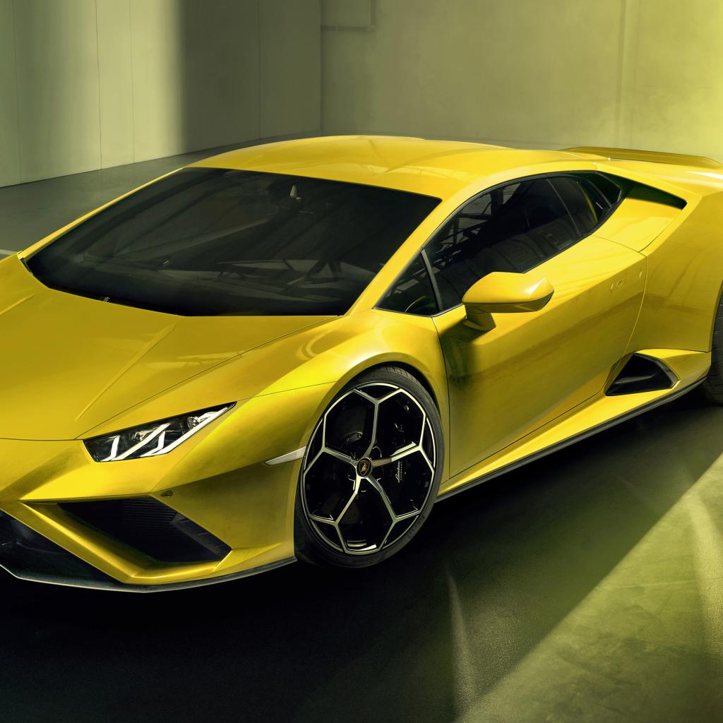 Обои Желтый автомобиль Lamborghini Huracan EVO RWD 2020 года в гараже