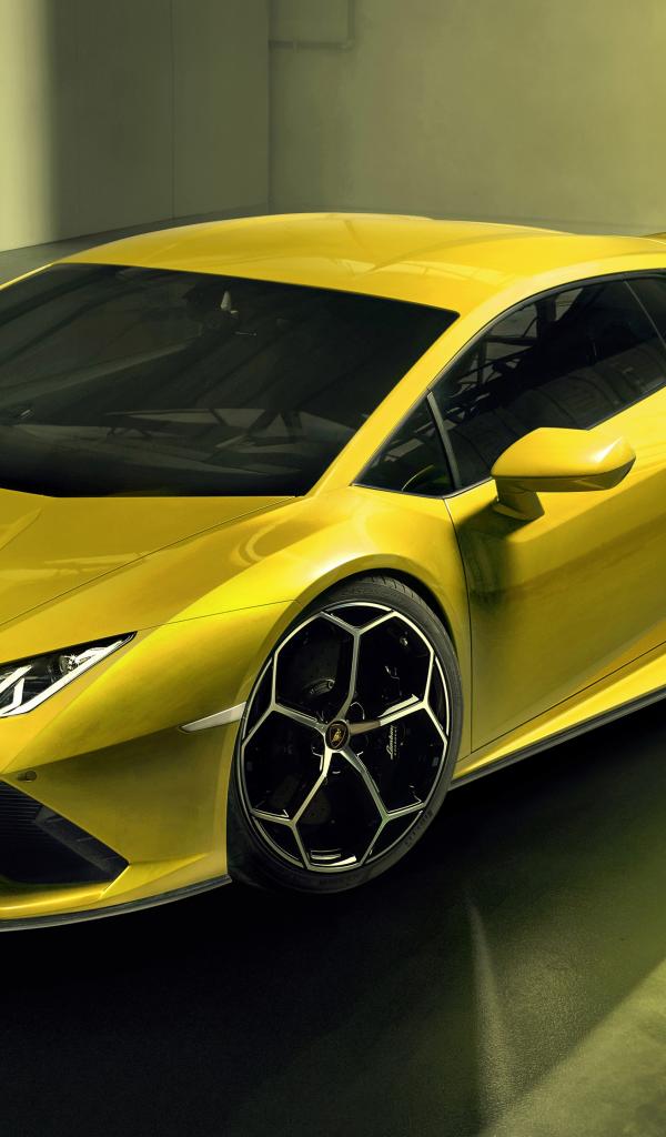 Обои Желтый автомобиль Lamborghini Huracan EVO RWD 2020 года в гараже