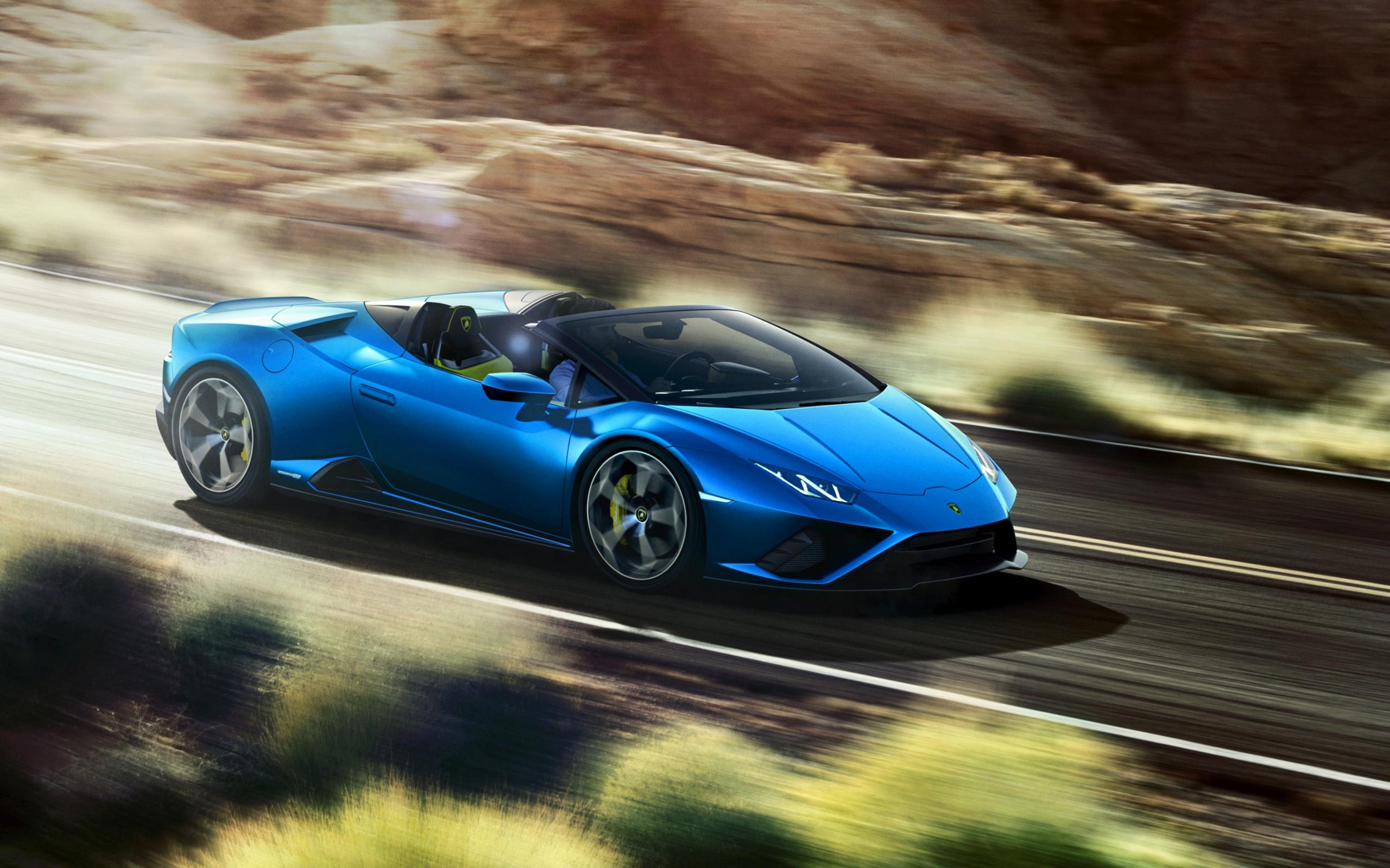 Обои Синий автомобиль Lamborghini Huracan EVO RWD Spyder 2020 года на скорости