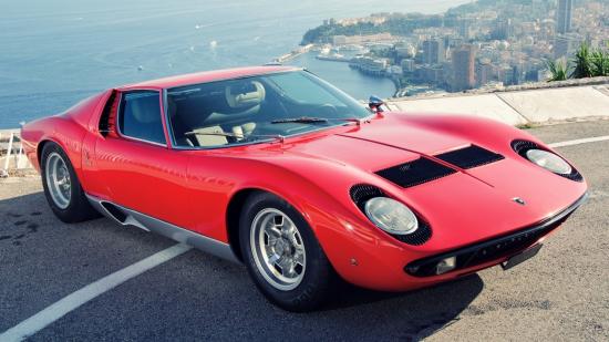 Обои Красный Lamborghini Miura на фоне города