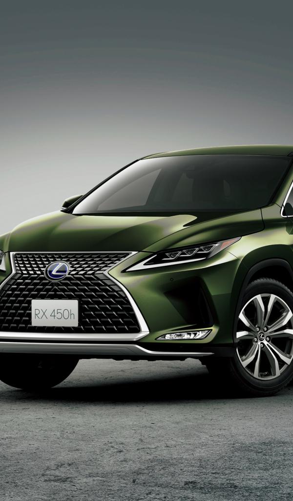 Обои Зеленый автомобиль Lexus RX 450h 2019 года на сером фоне