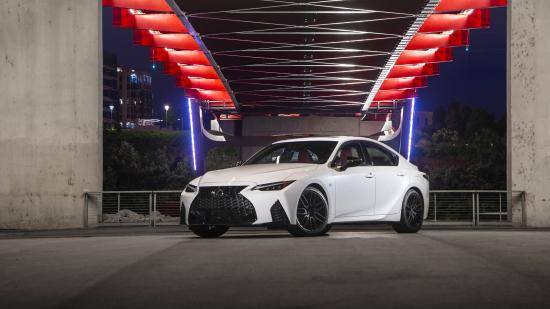 Обои Белый автомобиль Lexus IS 350 F SPORT, 2021 года под мостом