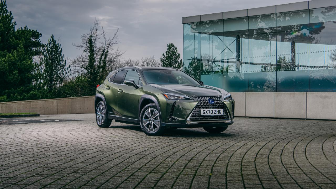 Обои Зеленый автомобиль Lexus UX 300e 2021 года у стеклянной стены