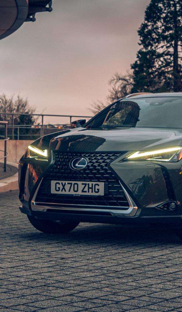 Обои Автомобиль Lexus UX 300e 2021 года с включенными фарами