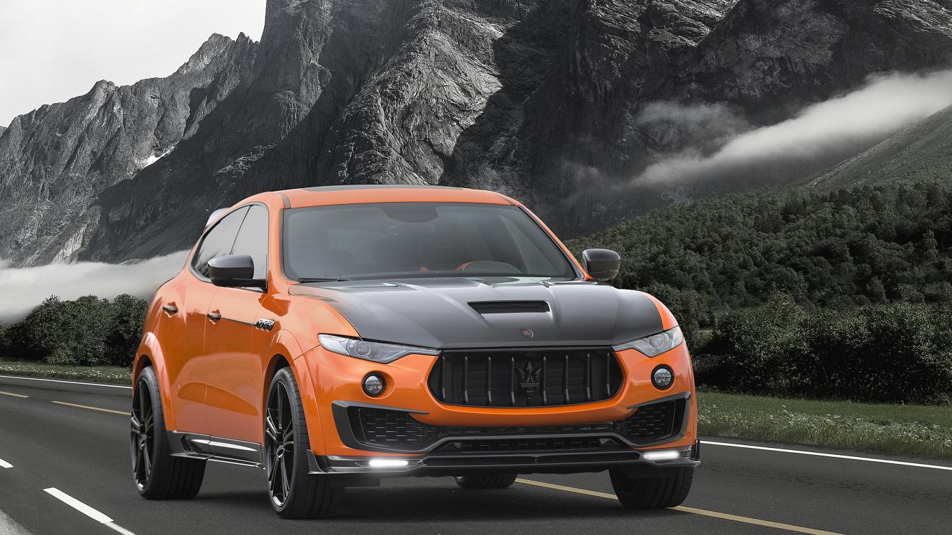 Обои Оранжевый автомобиль Maserati Mansory Levante, 2017 на фоне гор