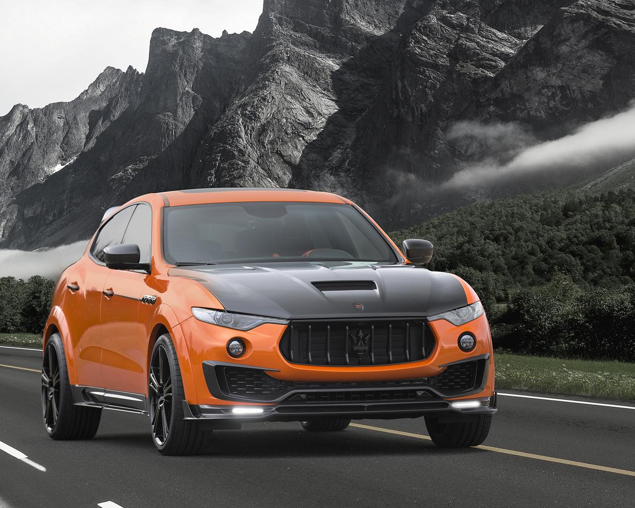 Обои Оранжевый автомобиль Maserati Mansory Levante, 2017 на фоне гор