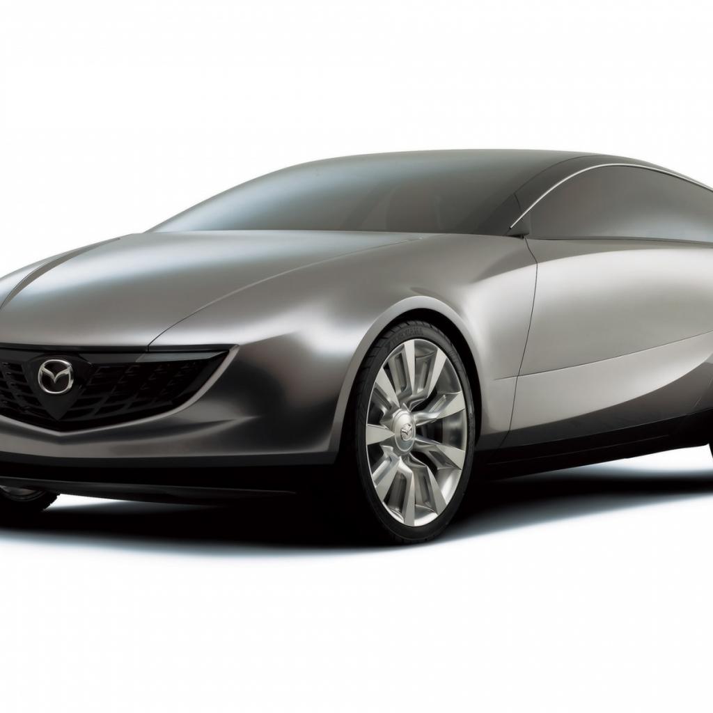 Обои Семейный автомобиль Мазда на фоне городских зданий