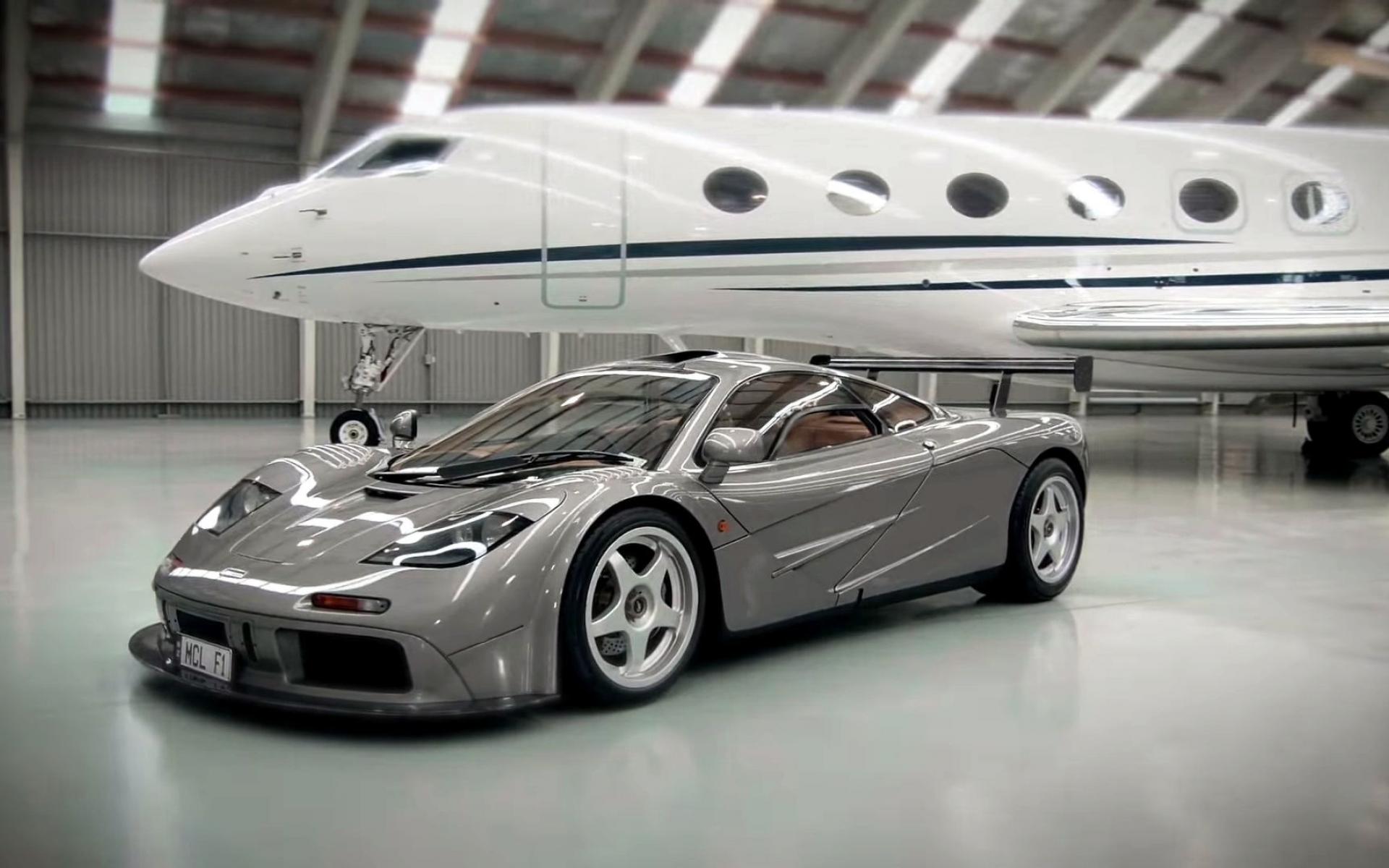 Обои Спортивный автомобиль McLaren F1 на фоне самолета