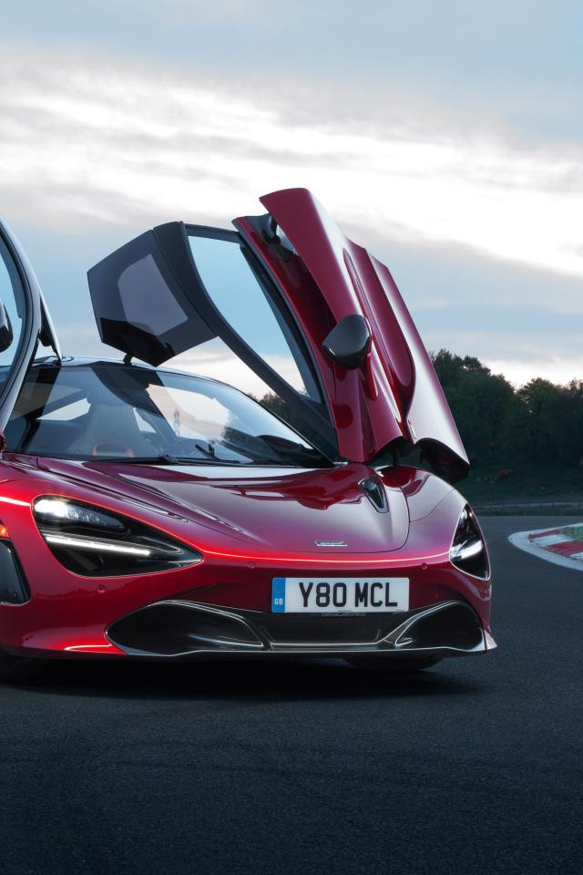 Обои Красный спортивный автомобиль McLaren 720s, 2018 с открытыми дверями