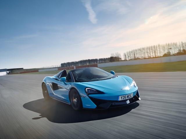 Обои Голубой спортивный автомобиль McLaren 570S, 2018 года на трассе