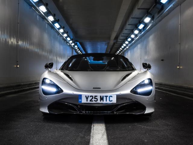 Обои Серебристый спортивный автомобиль McLaren 720S Spider, 2019 года в тоннеле