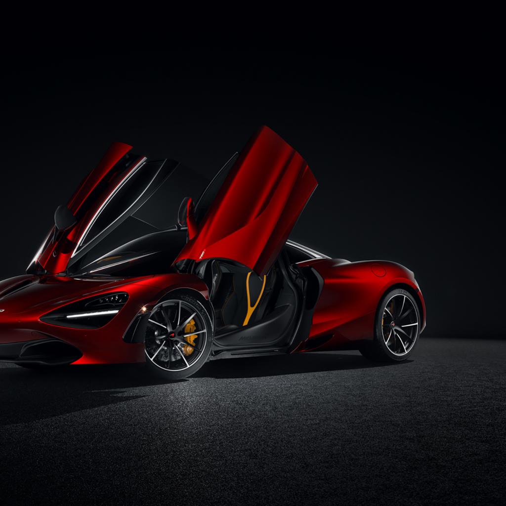 Обои Красный спортивный автомобиль McLaren 720S CGI с открытыми дверями